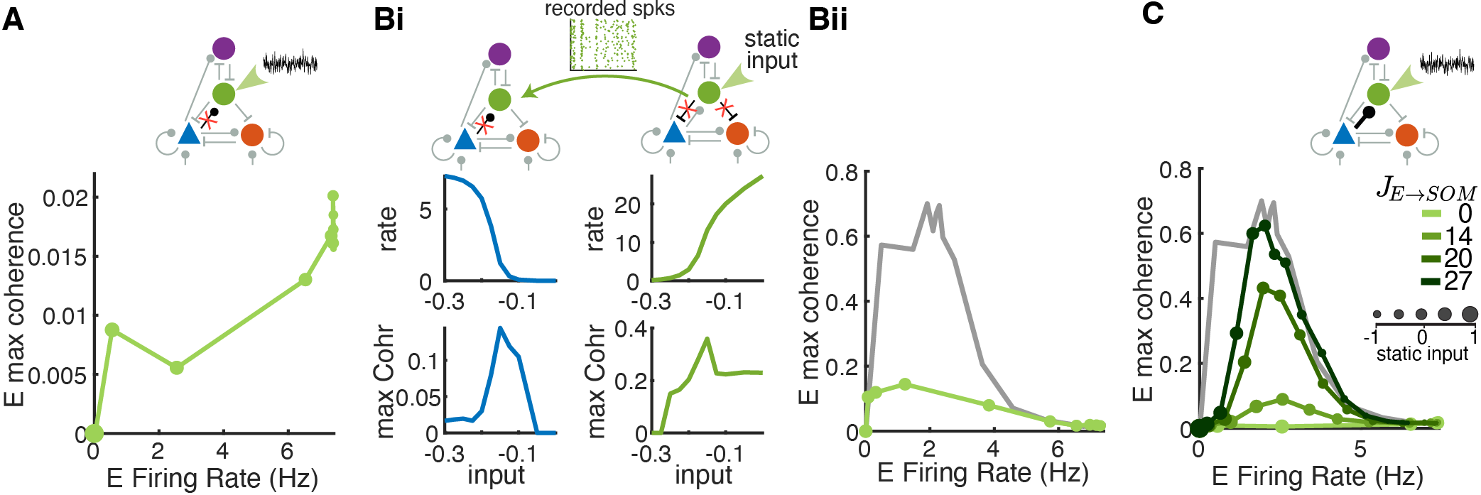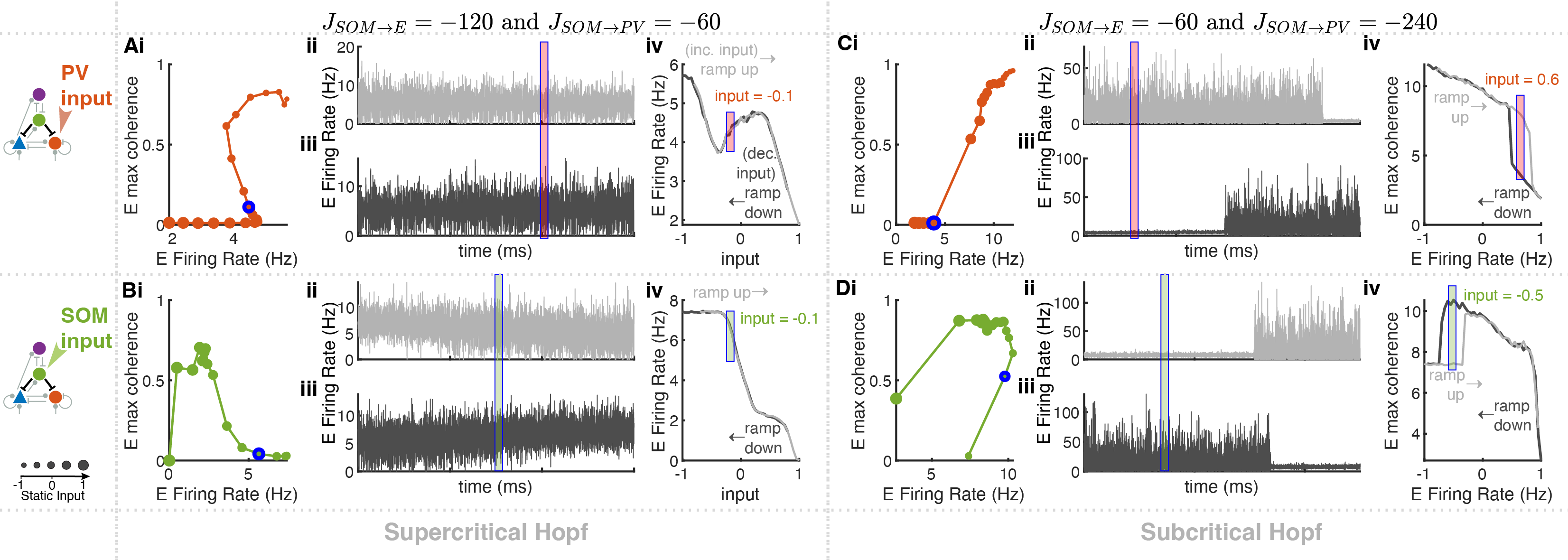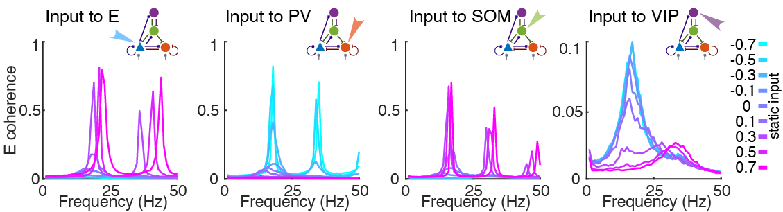 To this end, we design a four population interneuron network made up of excitatory (E) neurons and three inhibitory interneuron subtypes — parvalbumin (PV), somatostatin (SOM), and vasoactive intestinal peptide (VIP). Each neuron in the aforementioned population is modeled as an exponential integrate-and-fire (EIF) equation. Leveraging advancements in optogenetics (which allow cell-type-specific manipulations) and imbed biophysical relevant parameters and design in the computational model, we were able to probe the causal contributions of each interneuron subtype to circuit dynamics to understand the role of each population in the overall network response.